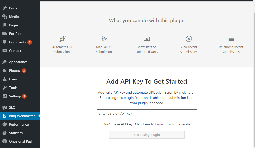 जैसे ही आप प्लगइन को एक्टिवटे करेंगे डैशबोर्ड में लेफ्ट साइड में Bing Webmaster नाम का एक मेनू बन जाएगा जैसा की नीचे चित्र में बताया गया है | और उसको जैसे क्लिक करेंगे तो बिंग एपीआई के एंटर करना होगा जिसके बाद ही आप अपनी वेबसाइट का यूआरएल सबमिट कर पाएंगे