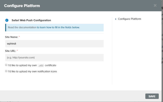- अब आपको wordpress dashbosrd में जाना है जहाँ oneSignal की सेटिंग में जाकर confugration tab में Apple safari api key के box में copy की हुई safari api key को paste करके नीचे save button पर click करके सभी settings को save करना है।