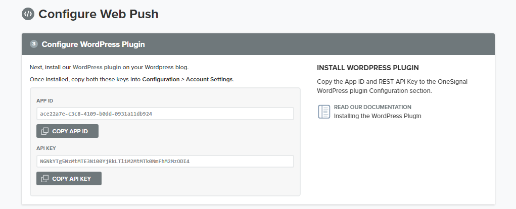 Website की जानकारी save करने के बाद इस step में आपको OneSignal की APP ID और API KEY मिलती है इस दोनो को copy करके रख लेना है।