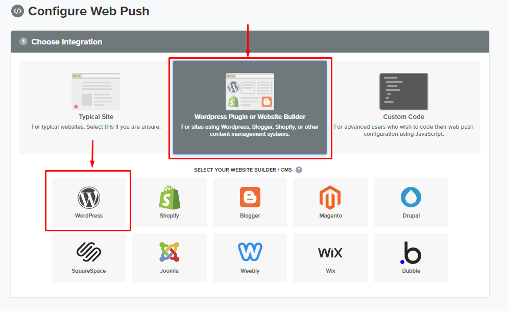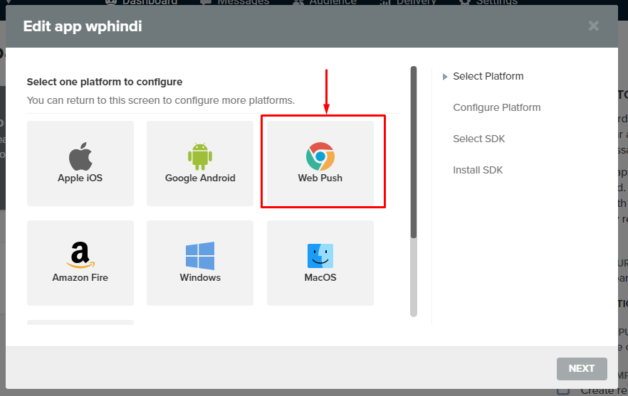 - इस Step के द्वारा platform को चुनना होता है जिसमे आपको web push को चुनना है। जैसे आप नीचे दिए गए screeshot में देख सकते हैं और next button पर click करना है।