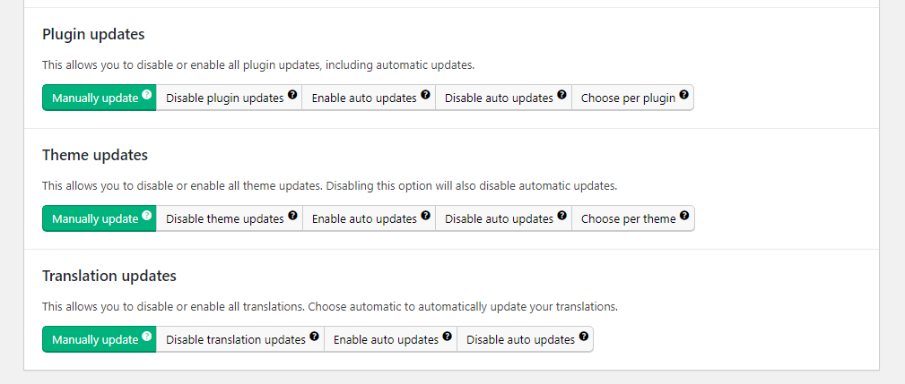 इसके बजाय, आप प्लगइन और थीम ऑटो-अपडेट को disable कर सकते हैं, लेकिन WordPress core ऑटो-अपडेट को छोड़ दें।