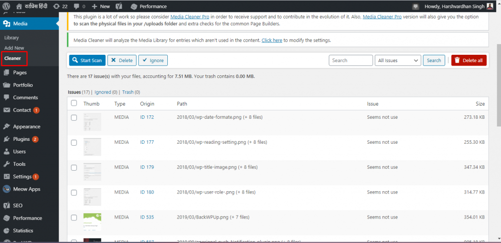 प्लगइन को एक्टिवटे करने के बाद आपको , अपने वर्डप्रेस मीडिया लाइब्रेरी इमेजेज देखने और उनका विश्लेषण करने के लिए Media >> Cleaner पेज पर जाएं।