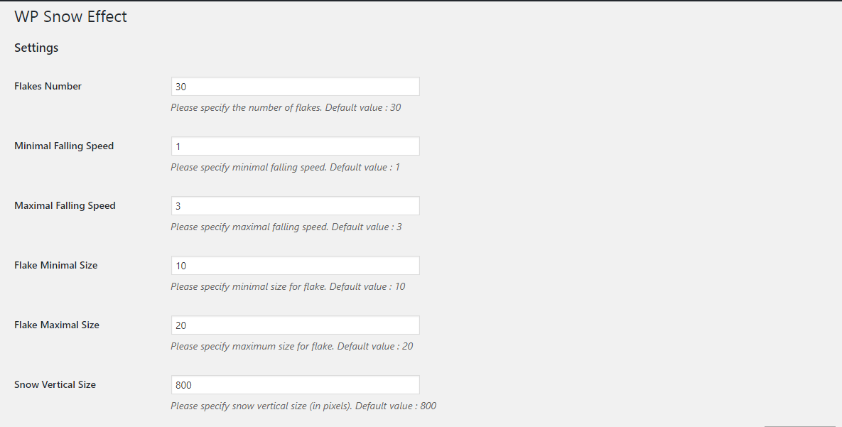 यहां, आप इसकी WP Snow Effect Setting कॉन्फ़िगर कर सकते हैं जैसे कि snowfall effect प्रदर्शित कर सकते हैं। जैसा कि आप नीचे स्क्रीनशॉट देख सकते हैं।