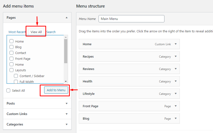 सबसे पहले Add Menu Item Section पर View All टैब पर क्लिक करें। इसके बाद उन categories, posts, pages को सेलेक्ट करें या Custom links add करें, जिन्हें आप अपने मेनू में Add करना चाहते है ।