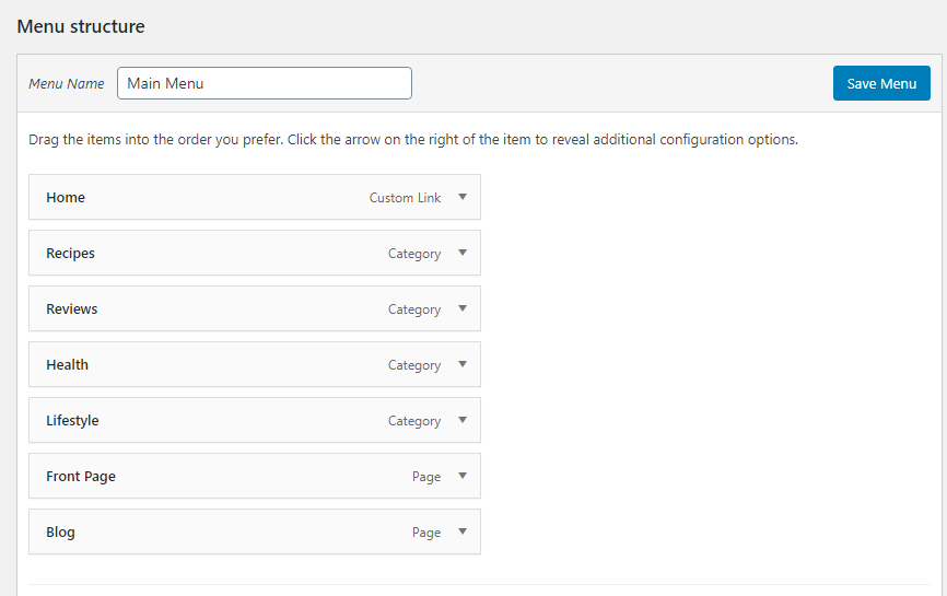 Menu items add के बाद, आप Menu Structure सेक्शन में जाकर ड्रैग और ड्रॉप करके उनके ऑर्डर को सेट कर सकते हैं।