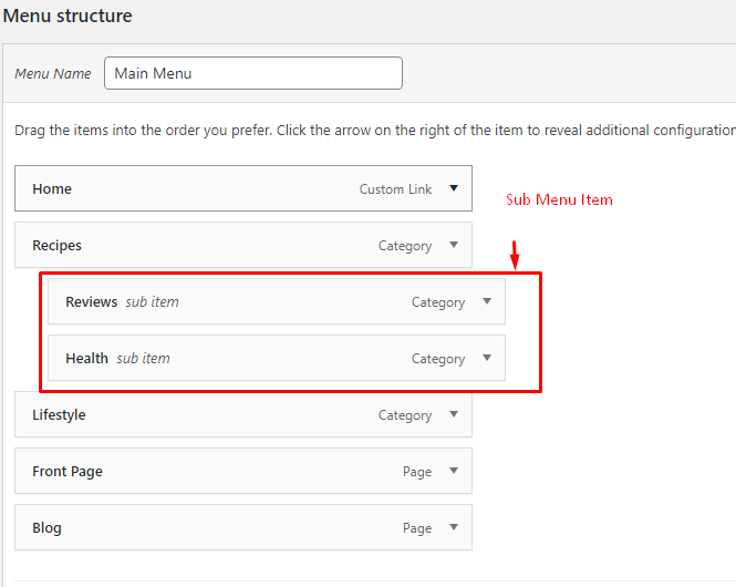 आप अपने मेनू के अंदर अगर आप Drop Down Menu बनाना चाहते है तो Sub-menus or drop-down menus बनाने के लिए, एक मेनू आइटम को दूसरे मेनू आइटम के दाईं ओर Drag करें। इससे आपके मेनू के अंदर सब मेनू बन जायेंगे