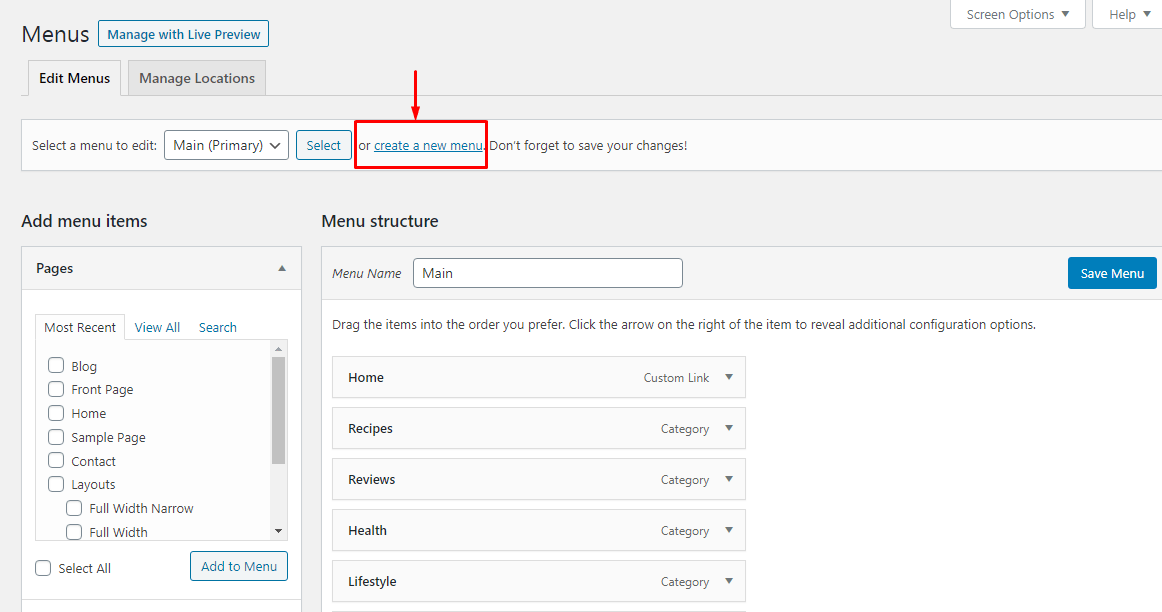Navigation menu बनाने के लिए, Appearance >> Menus पर क्लिक करें। जैसे ही आप Menus पर क्लिक करेंगे तो Menus Manage With Live Preview डैशबोर्ड आ जायेगा जैसा की नीचे फोटो में बताया गया है