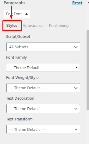 Styles टैब आपको Script, Font Family, Font Weight, Text Decoration और Text Transform कस्टमाइज करने की अनुमति देता हैं। Font family आपको बहुत सारे font style प्रदान करता है।
