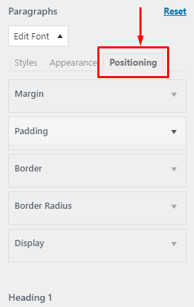 Positioning टैब आपको margin, Padding, Border, Border Redius , Display आदि की सेटिंग करने की अनुमति प्रदान करता है |