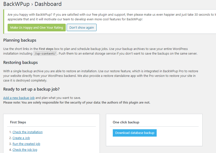इस तरह आप डैशबोर्ड में पहुंच जाएंगे जहा New Job Create कर सकते है और आप Database Backup बैकअप डाउनलोड कर सकते है आपको BackWpup से सम्बंधित टुटोरिअल दिए हुए है जिसे जिसके द्वारा आप इसको उसे करना सीख सकते है |