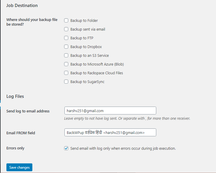 इसके बाद आपको Job Destination आप्शन दिखाई देगा। जैसा की आपको नीचे दिए गए चित्र में बताया गया है | यह आपके WordPress backup फाइल को Backup To Foler, Backup Sent Via Email , Dropbox, Amazon S3, Windows Azure, Rackspace, और SugarSync आदि पर स्टोर करने की अनुमति देता है। साथ ही आप अपने बैकअप को email पर भी send कर सकते है और सर्वर पर भी स्टोर कर सकते है |
