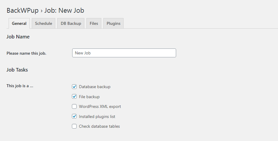 जैसे ही आप Add New Job पर क्लिक करेंगे General Tab ओपन होगा अपनी job के लिए एक नाम entre करें। Job Tasks सेक्शन में, Backup Option जैसे (Database backup, File backup, WordPress XML export, Installed plugins list, Check database tables) को चेक करें जिन्हें आप Backup करना चाहते हैं।