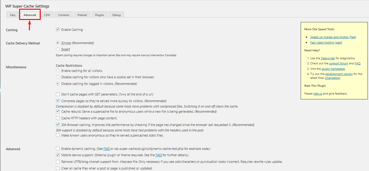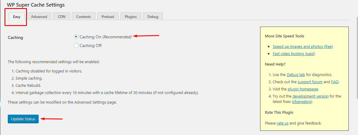 यहां WP Super Cache plugin की Settings दी गयी हैं,